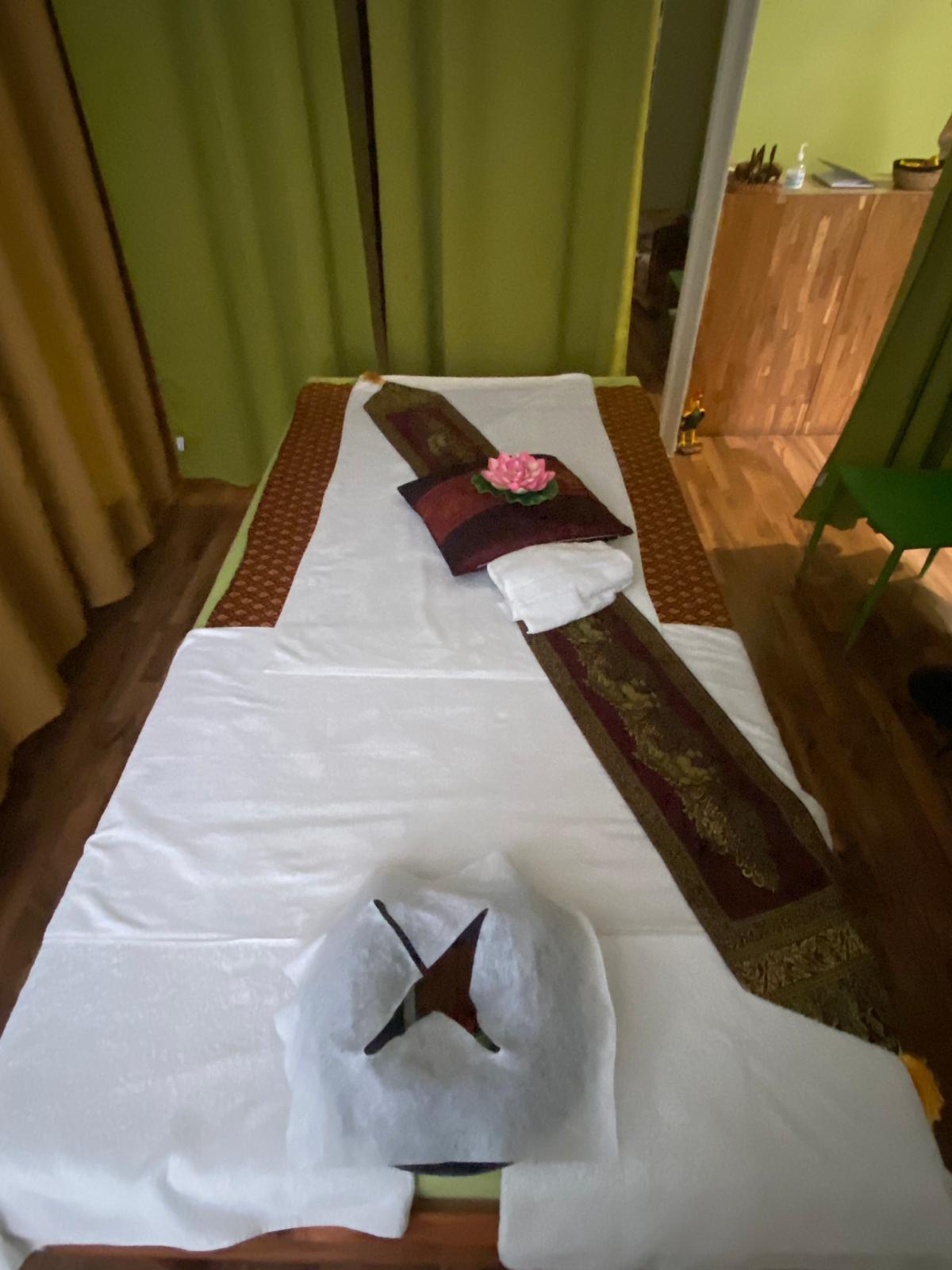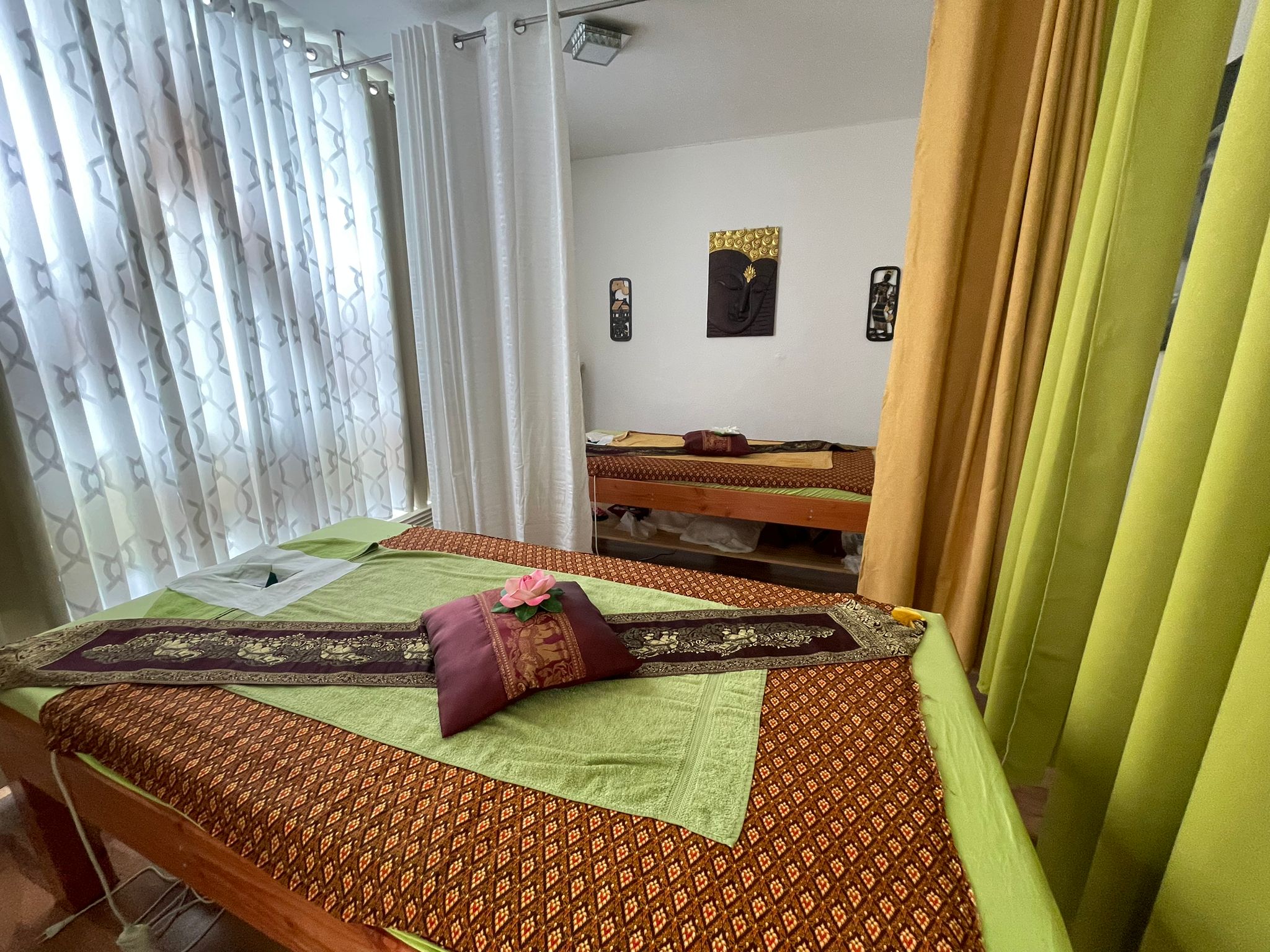 besteht aus passiven Streckpositionen und Dehnbewegungen, Gelenk-mobiiationen und Druckpunktmassage. Zehn ausgewählte Energielinien werden über sanfte Dehnung und mit dem rhytmischen Druck von Hand-ballen, Daumen, Knien, Ellenbogen und Füßen bearbeitet. Die Thai-Massage findet bekleidet statt. Der freie Fluss dieser Energien fördert die Harmonie des Körpers und der Seele. Das Immunsystem wird gestärkt, die Kraft und Elastizität des Körpers spürbar verbessert.